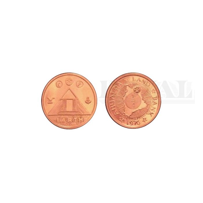 The token set consists of three token redeemable in gold weights: 1) Earth obverse with 1976 Ahualoa Land Bank and 1/4 (one quarter gram of gold) inner die reverse; 2) Eden obverse with Volcano Island Bank and 1/10 (one tenth gram of gold) inner die reverse dated 1977 and 3) Atlantis obverse with Kona Coast Bank and 1/100 (one hundredth gram of gold) inner die reverse dated 1978.